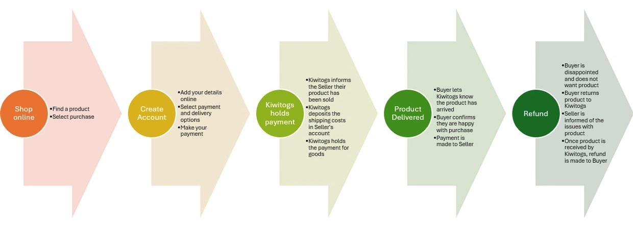 Payment for the products is held by KiwiTogs until the purchaser has confirmed the product as acceptable. Once confirmation has been received, payment is made to the seller